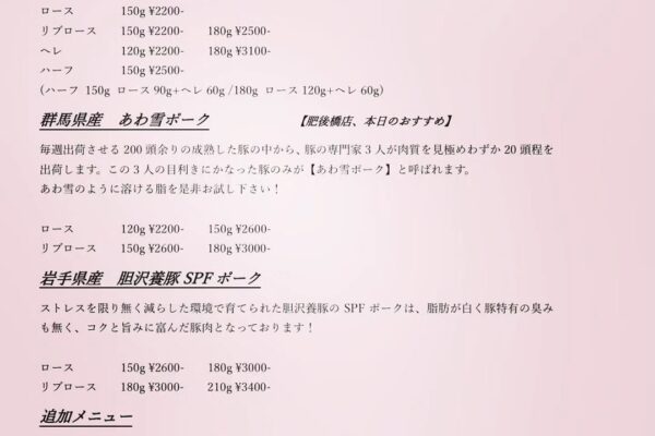 常時ご用意している『林SPF』は、穀物を中心としたオリジナル飼料で育てられた銘柄豚です。抗生物質の使用を限りなく抑えた清潔な環境で肥育されており、きめ細かくやわらかな肉質と、甘く芳醇な脂の香りが魅力です。さらに、茨城県産『三右衛門』や群馬県産『あわ雪ポーク』など、希少な銘柄豚も日替わりでご用意。仕入れ状況に応じて、その日ならではの味わいをお楽しみいただけます。
