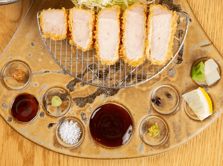 銘柄豚の美味しさをより深く味わっていただくために、調味料とご飯にもこだわっています。わさびや柚子胡椒、生胡椒、山形の辛子麹、刻み漬物、醤油、大阪産いちじくソースなど、9種の薬味とソースを揃え、一切れごとに味の変化をお楽しみいただけます。ご飯は奈良県産ヒノヒカリをベースに山形県産はえぬきをブレンドした独自配合で、甘さを少し控えめにすることで豚の旨みを邪魔しない味わいに仕上げています。
