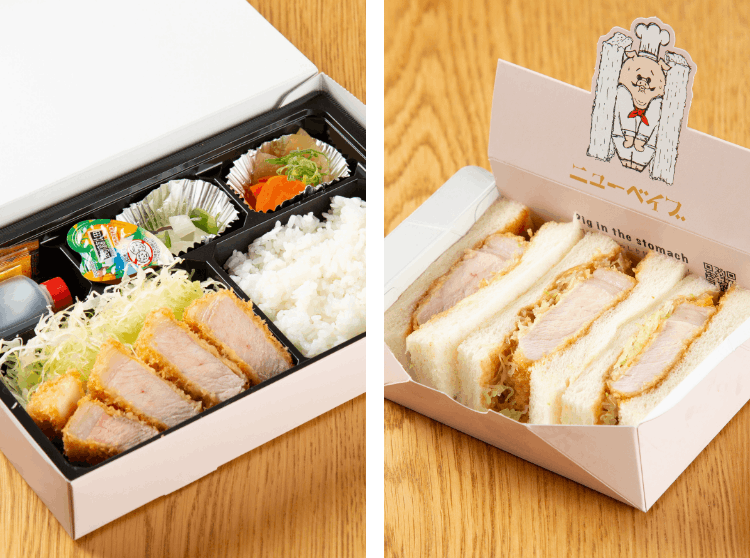 「ニューベイブ肥後橋」では、ご自宅や職場でも銘柄豚の美味しさを楽しめるテイクアウトメニューをご用意しています。お持ち帰り人気No.1の『カツサンド(税込 1,580円)』は、おやつにも手土産にも選ばれる一品。さらに、『林SPFロース弁当』『林SPFヘレ弁当』『林SPFリブロース弁当』など、部位ごとの魅力を味わえるお弁当も揃い、食べ応えも満足感もたっぷりです。