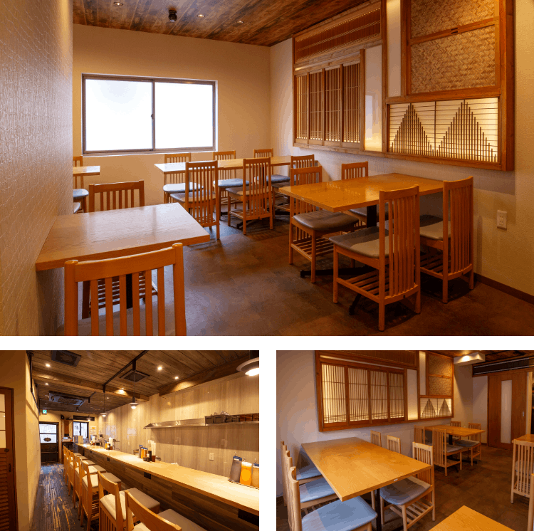 お一人でもご家族でも、心地よく過ごせる開放感あふれる空間が広がります。1階には、職人の技を間近に感じられるカウンター席と、気軽に使いやすいテーブル席を、2階には、少人数でのお食事からご家族やご友人とのお集まりまで対応できるテーブル席をご用意。シーンに合わせて、ゆったりとお過ごしいただけます。全席禁煙で快適にお食事を楽しめるほか、ディナータイムは席のみのご予約も承っております。