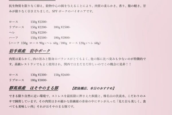 おはようございます😊 ニューベイブ肥後橋店です🐷 本日の銘柄豚です✨ ・千葉県産 林SPFポーク ・岩手県産 岩中ポーク ・群馬県産 ほそやのまる豚 以上の3種をご用意しております✨ 平日はお得なラン…